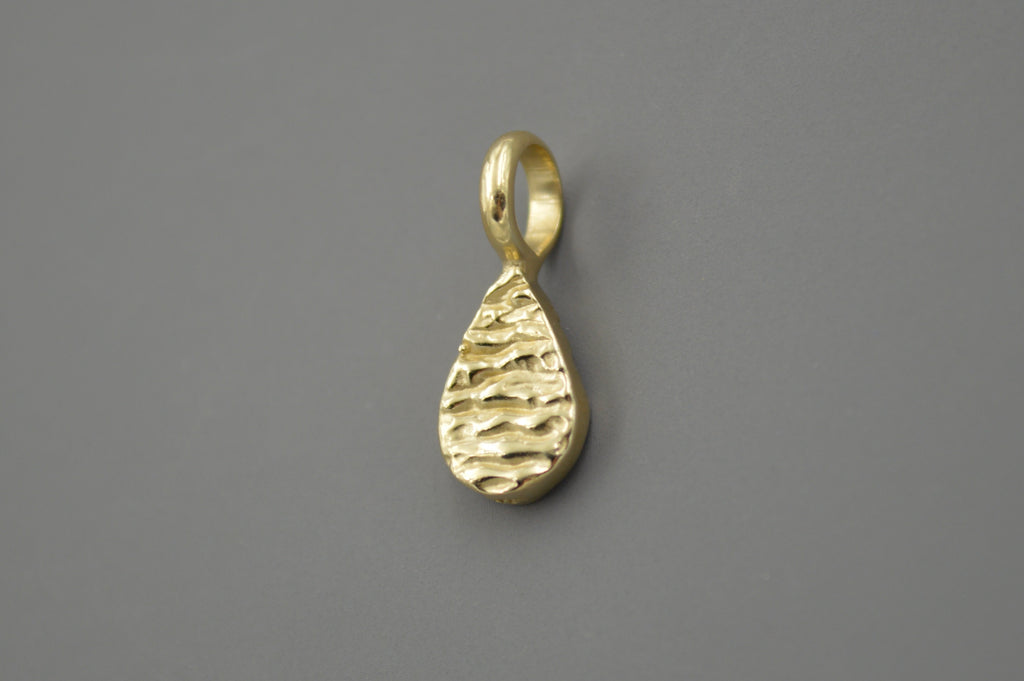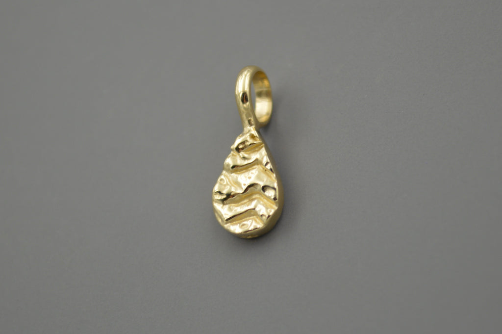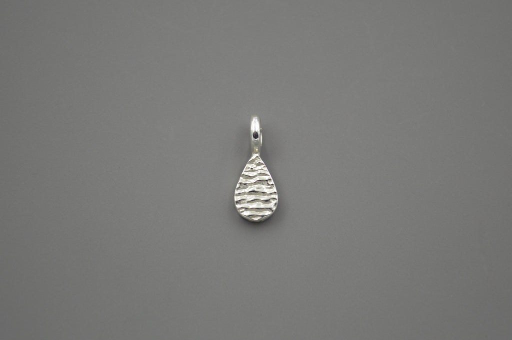 This is the Afloat pendant. It is double sided. One side has calmer ripples of water while the other has choppier waves within the teardrop shape. I find water and its many metaphors for life to be very inspiring. We need it to live, enjoy its beauty in many forms and are astounded by its fierceness at times.
