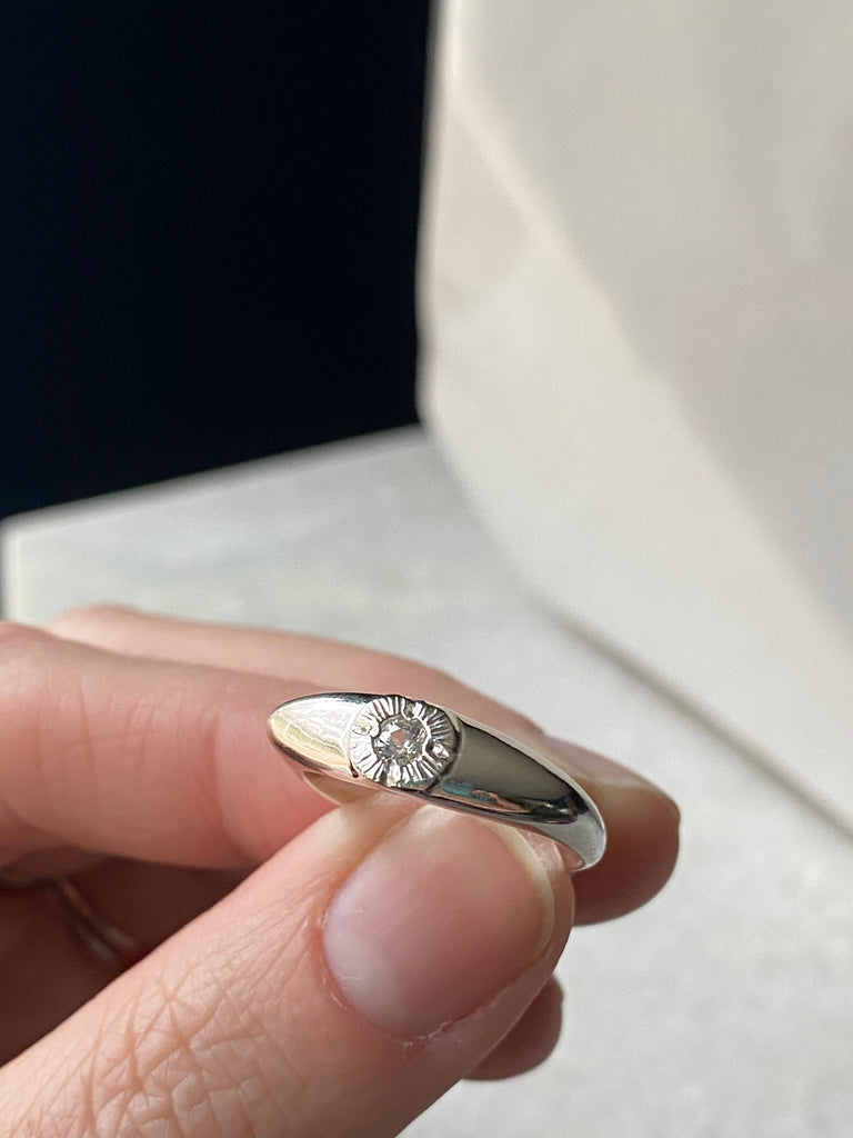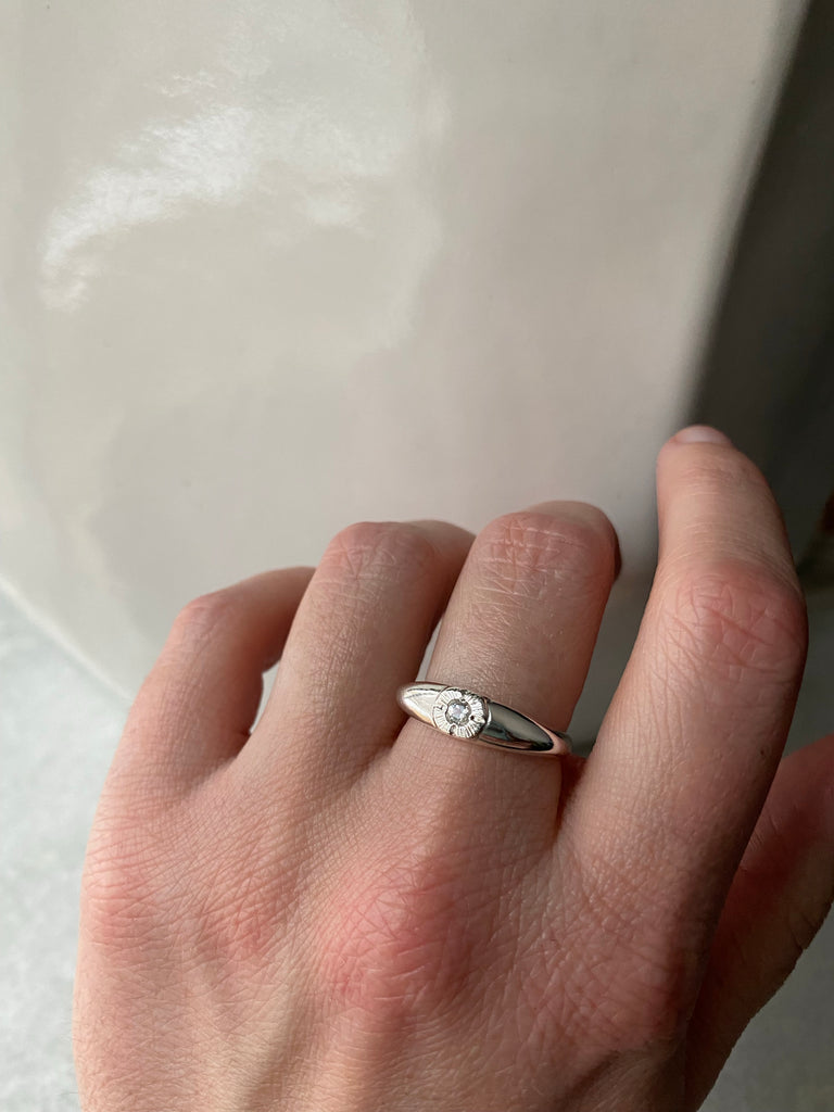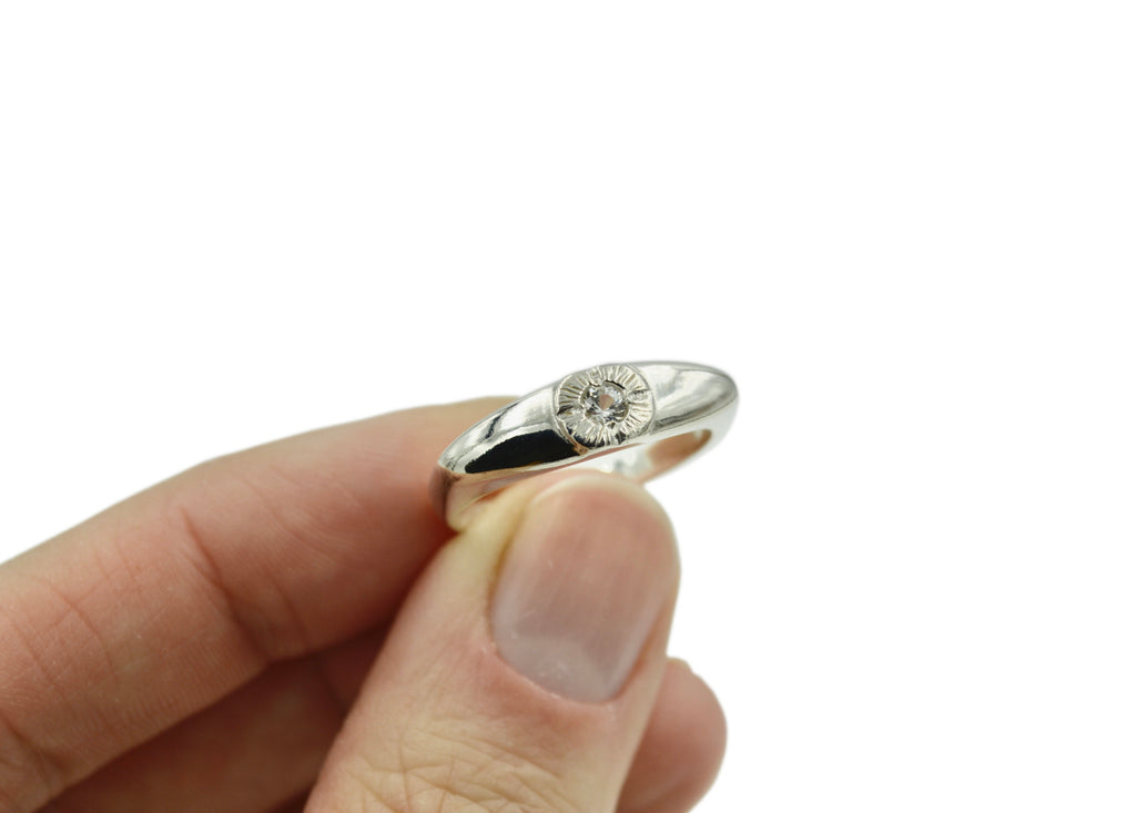 This solid Sterling Silver Bright Eye Ring has a 3mm White Sapphire set as its pupil.