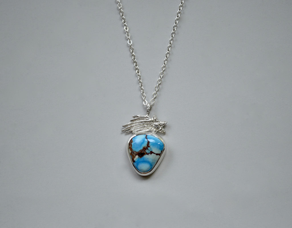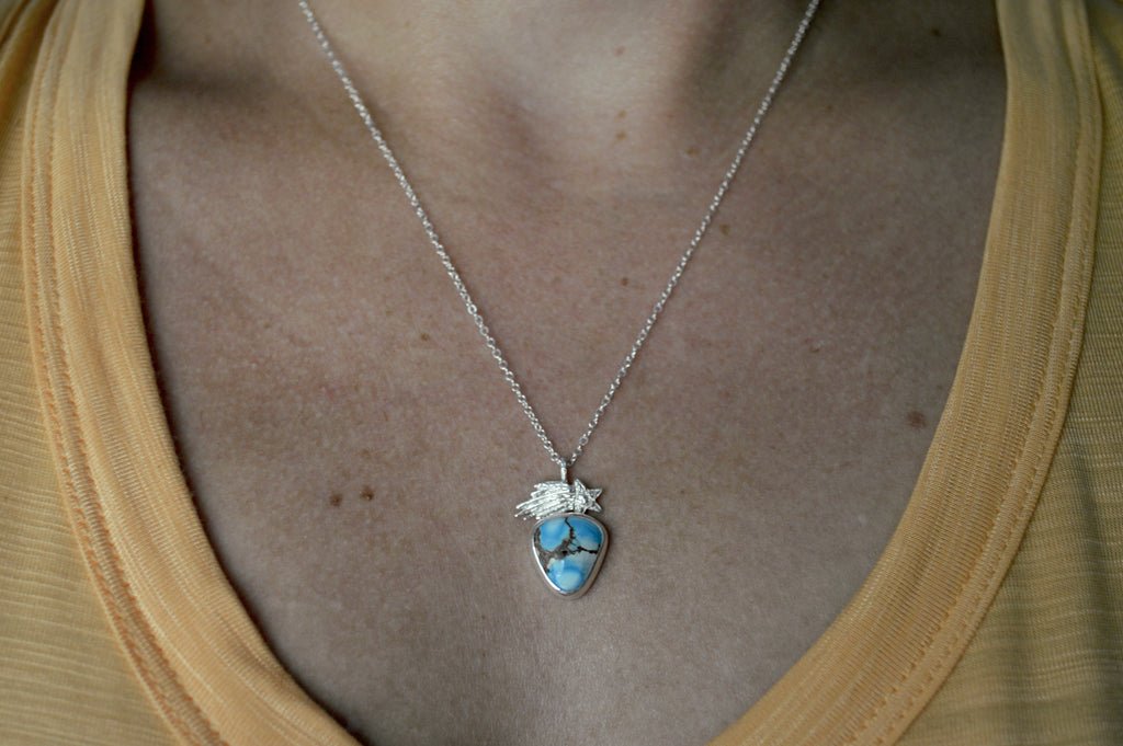 A stunning Golden Hills Turquoise pendant. A stone you could truly get lost in! The pendant is made with a shooting star bail that was hand carved in wax and cast into solid sterling silver. The turquoise stone is nestled in a fabricated bezel setting from sterling and fine silver.