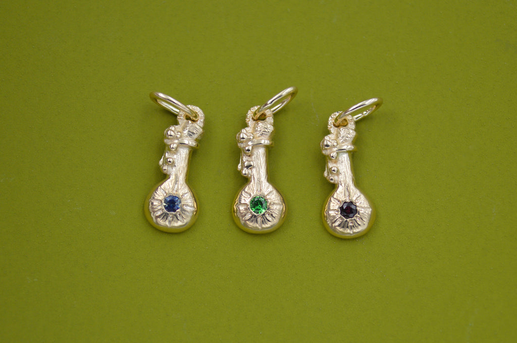 A fun pre Halloween treat! These potion bottles were hand carved in wax and then cast into solid 14k gold. Each is sold separately.