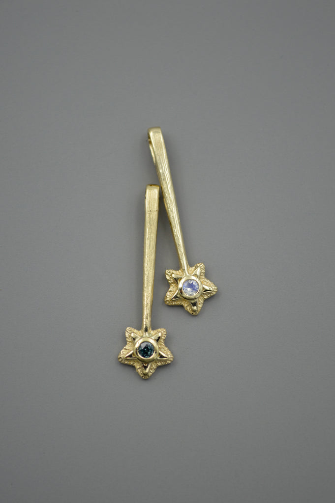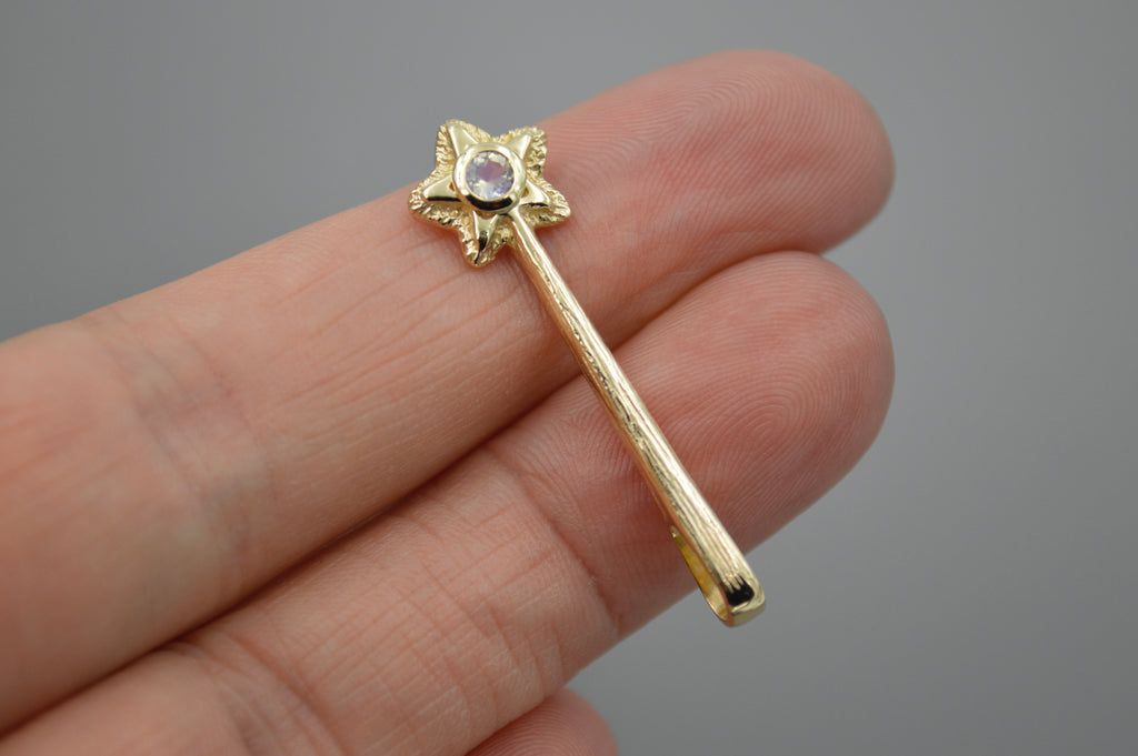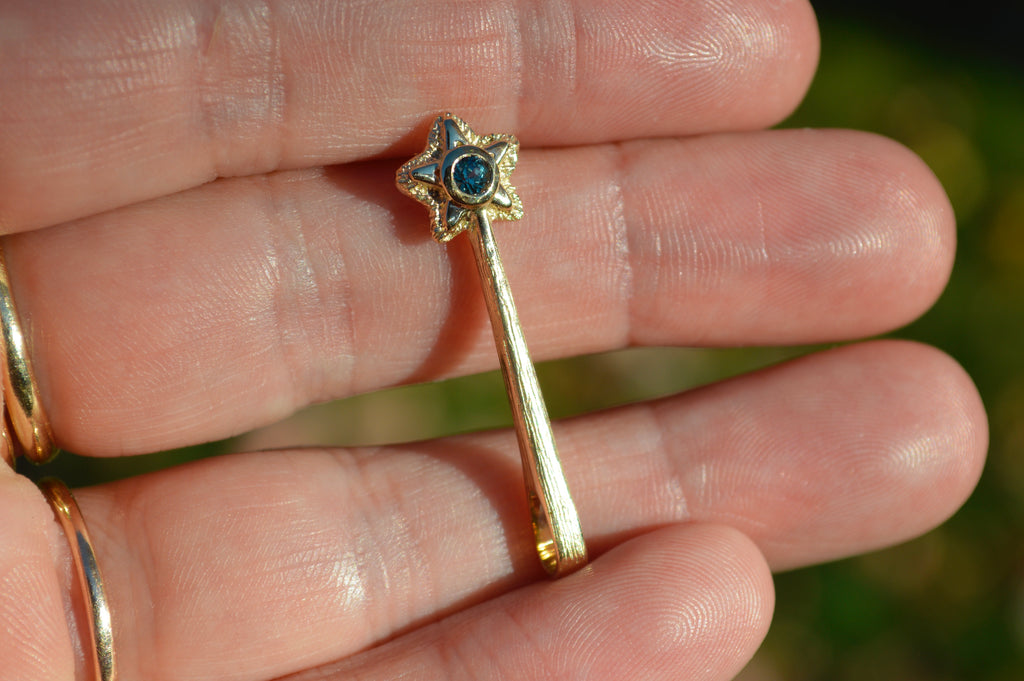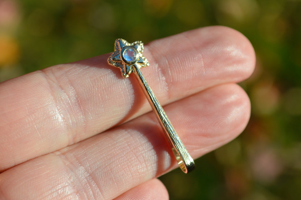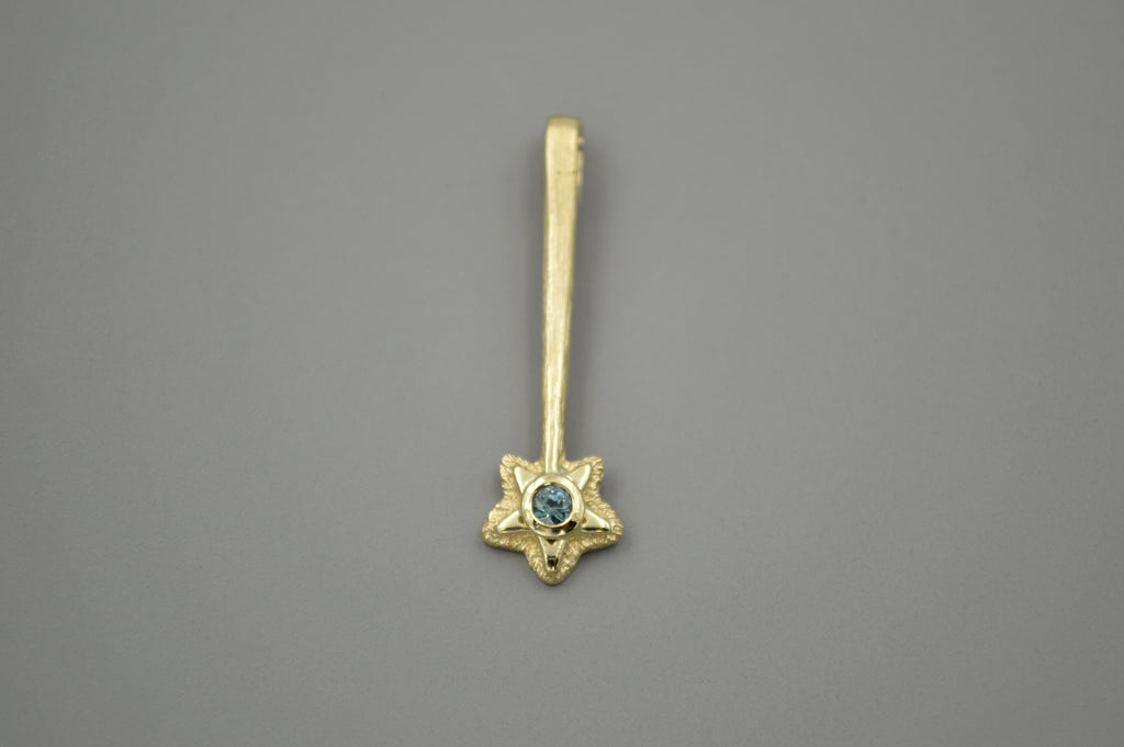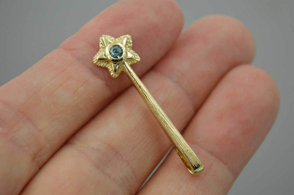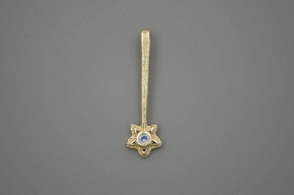 A magical star wand to wear around your neck. It was first hand carved in wax and then cast into solid metal. Bail is at the end of the wand so the star hangs on the bottom. This version has an added gemstone and is in solid 14k.