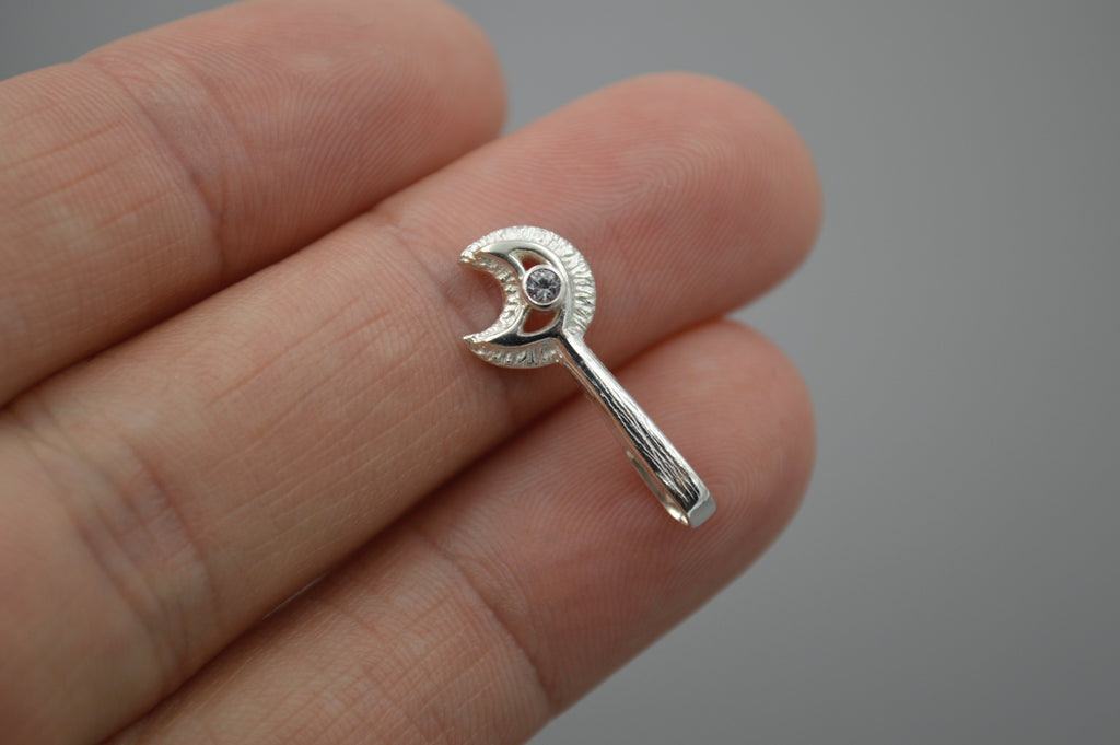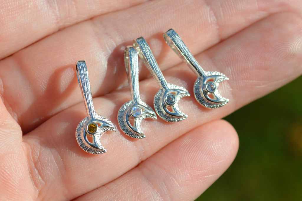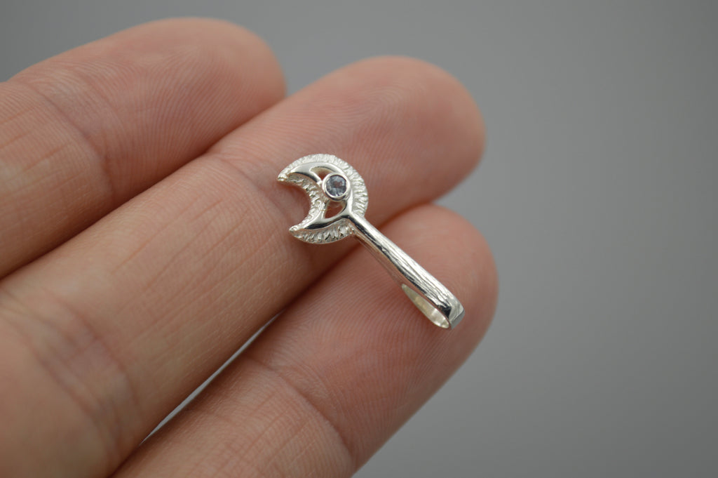 A magical moon wand to wear around your neck. It was first hand carved in wax and then cast into solid metal. Bail is at the end of the wand so the moon hangs on the bottom. Add some magic to your collection. This version has an added gemstone to the moons center.