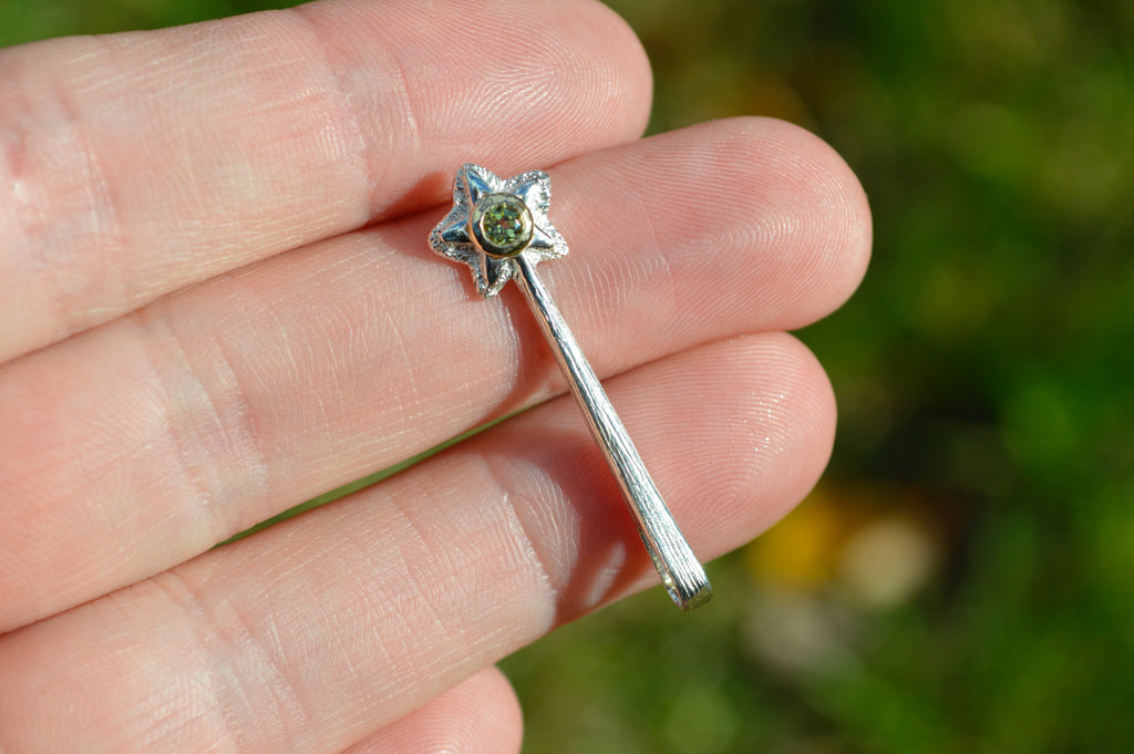 A magical star wand to wear around your neck. It was first hand carved in wax and then cast into solid metal. Bail is at the end of the wand so the star hangs on the bottom. This version is in sterling silver and has an added gemstone with a 14k yellow gold setting.