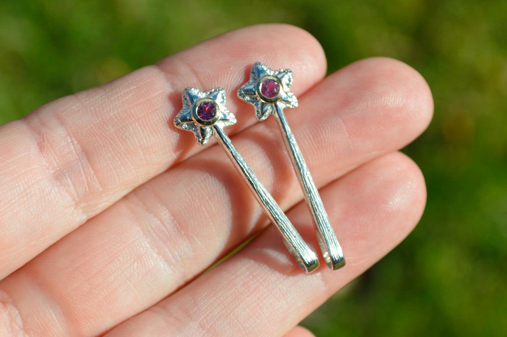 Materials: Wands are sterling silver with a 14k yellow gold bezel. Gemstones are approx 3mm, are natural and may have minor inclusions.
