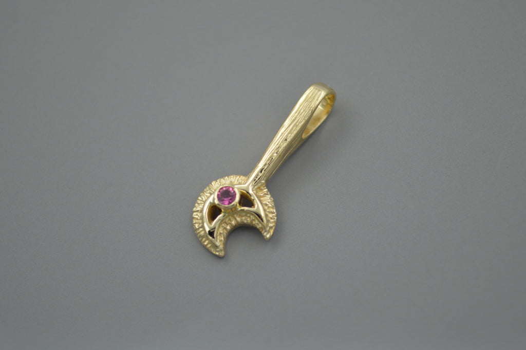A magical moon wand to wear around your neck. It was first hand carved in wax and then cast into solid metal. Bail is at the end of the wand so the moon hangs on the bottom. Add some magic to your collection. This version has an added gemstone to the moons center and is solid 14k yellow gold.