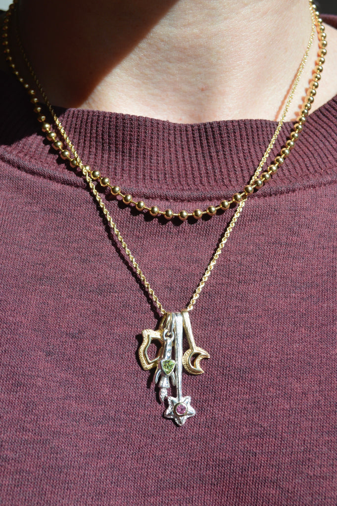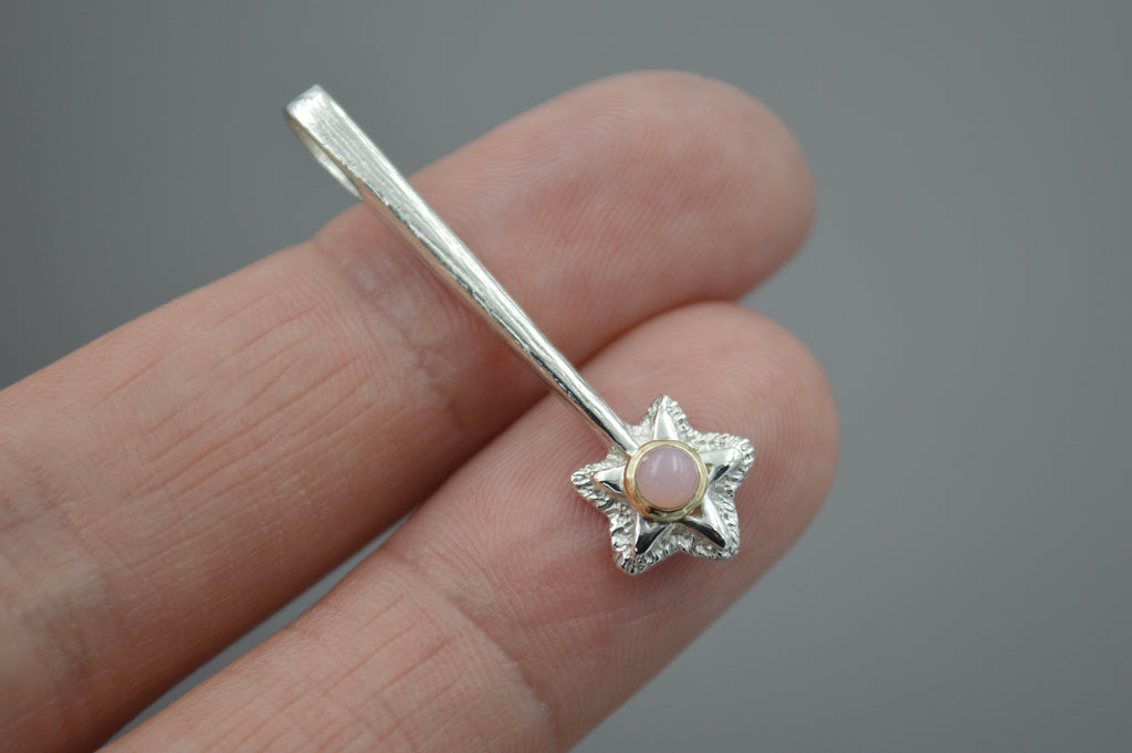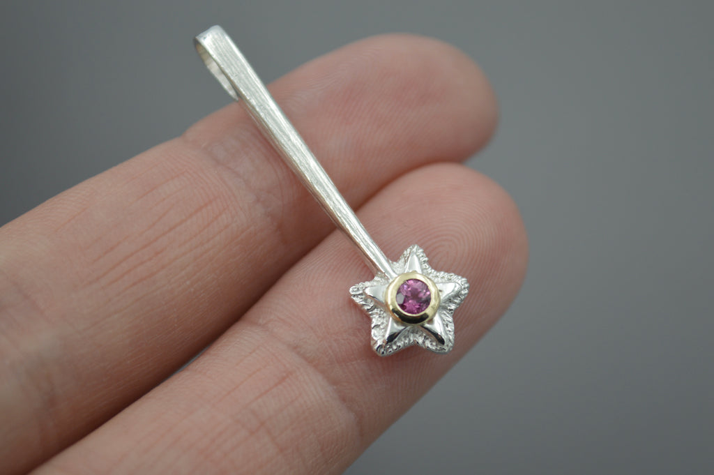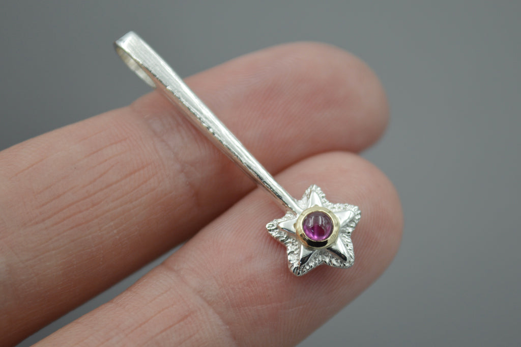 A magical star wand to wear around your neck. It was first hand carved in wax and then cast into solid metal. Bail is at the end of the wand so the star hangs on the bottom. This version is in sterling silver and has an added gemstone with a 14k yellow gold setting.