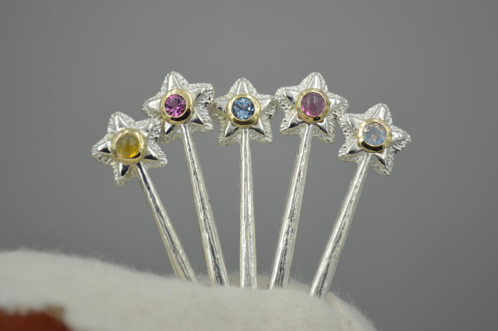 Materials: Wands are sterling silver with a 14k yellow gold bezel. Gemstones are approx 3mm, are natural and may have minor inclusions.