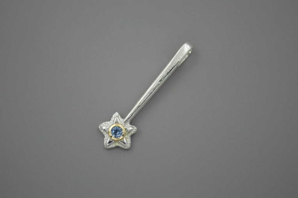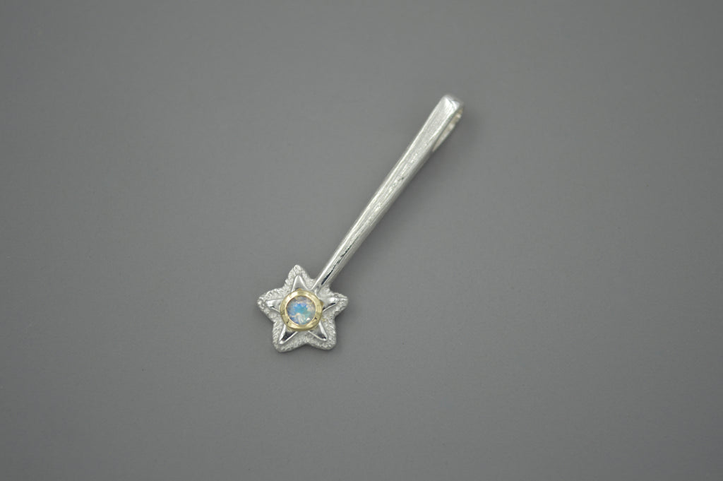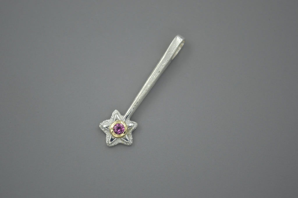 A magical star wand to wear around your neck. It was first hand carved in wax and then cast into solid metal. Bail is at the end of the wand so the star hangs on the bottom. This version is in sterling silver and has an added gemstone with a 14k yellow gold setting.