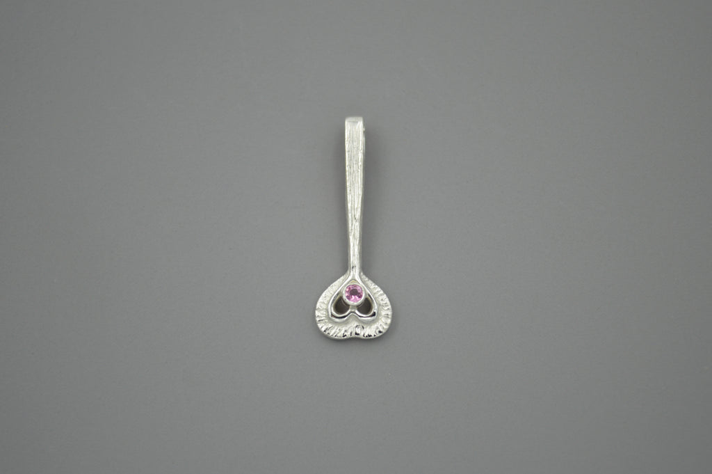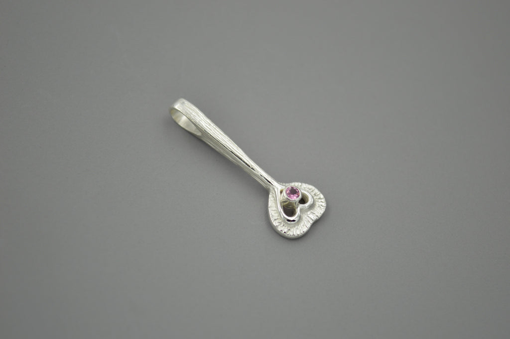 A magical little fairy wand, at least how I imagine it, to wear around your neck. It was first hand carved in wax and then cast into solid metal. Bail is at the end of the wand so the heart hangs upside down. This version has a 2mm pink tourmaline tube set into the center of the heart.